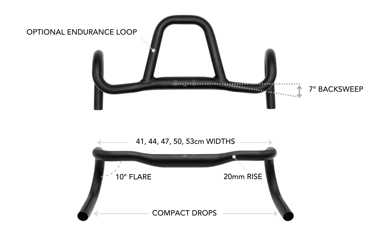 You can choose between a non-loop and a loop version of the Kitchen Sink Handlebar. With either style you get the same rise, back sweep, and compact drop. The loop allows for alternative hand positions, mount points, and a spot to use the new Kitchen Sink Handlebar Bag and Computer Mount.